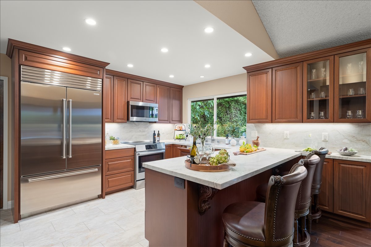 To achieve our goal of making the room feel larger without changing its footprint, savvy subtle changes were included , the original low sitting ceiling that hovered above the u-shaped kitchen was opened up and raised, for a greater spacious feel. We extended the countertop to include counter height seating, plentiful space for meal prep and a trendy buffet setting. High end Stainless steel appliances, view-full functional sink and creamy paint add to the new tailored look.