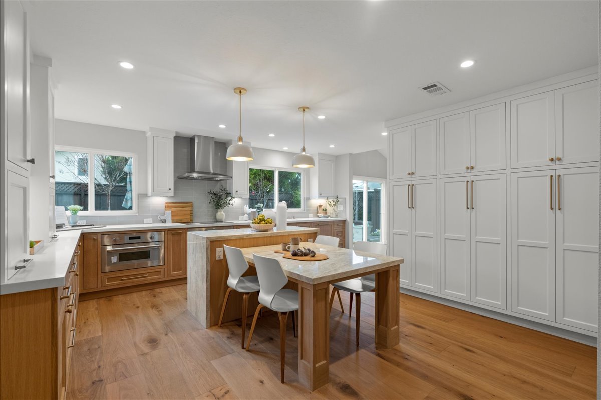 May Construction is thrilled to unveil a breathtaking metamorphosis in the heart of San Jose. This luxury home renovation transcended mere remodeling, crafting a symphony of light, space, and exquisite finishes. The project began by dissolving the once-confining walls of the U-shaped kitchen. Now, bathed in natural light streaming through a new Milgard Tuscany windows, the kitchen seamlessly integrates with the living and dining areas. This open-concept masterpiece fosters connection and creates a social hub for entertaining.