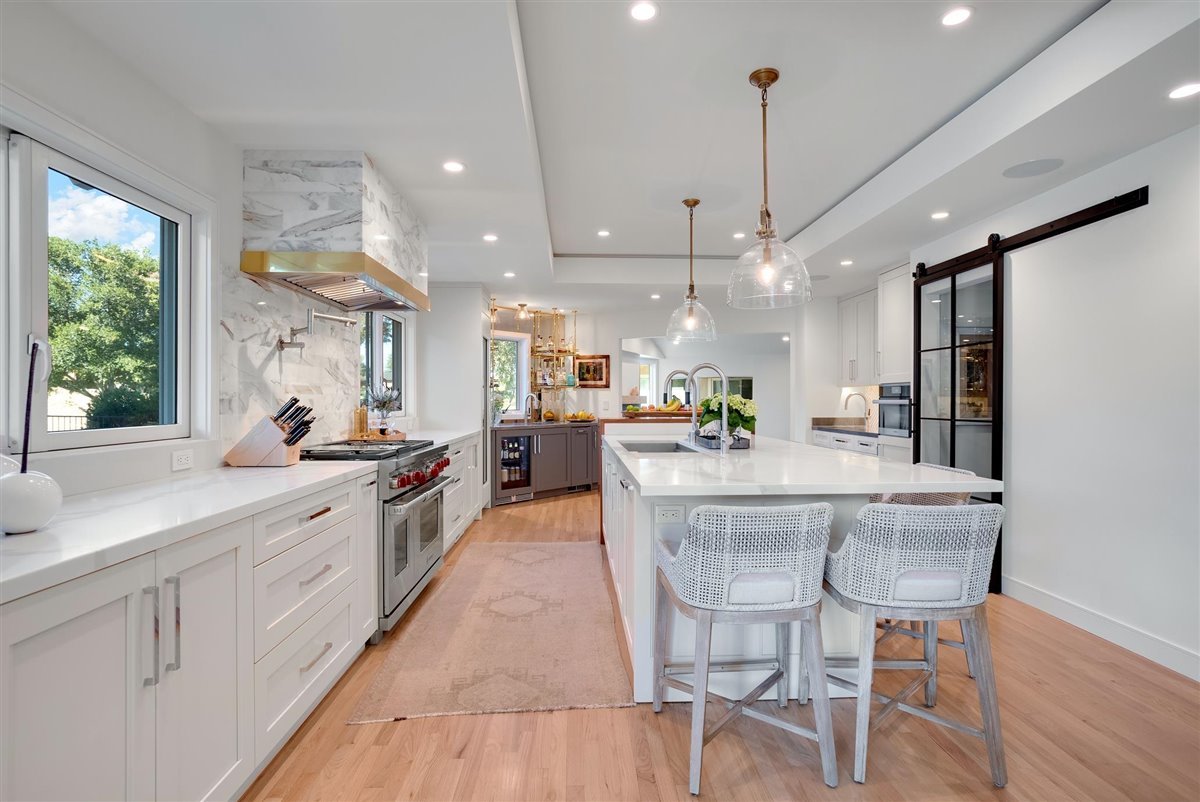 Step into the heart of the home and behold the epitome of sleek sophistication. Crisp white shaker cabinets adorned with opulent brass and wooden accents, a captivating fireplace, nestled within a wooden mantle and stone surround, commanding attention and setting the stage for unforgettable gatherings.