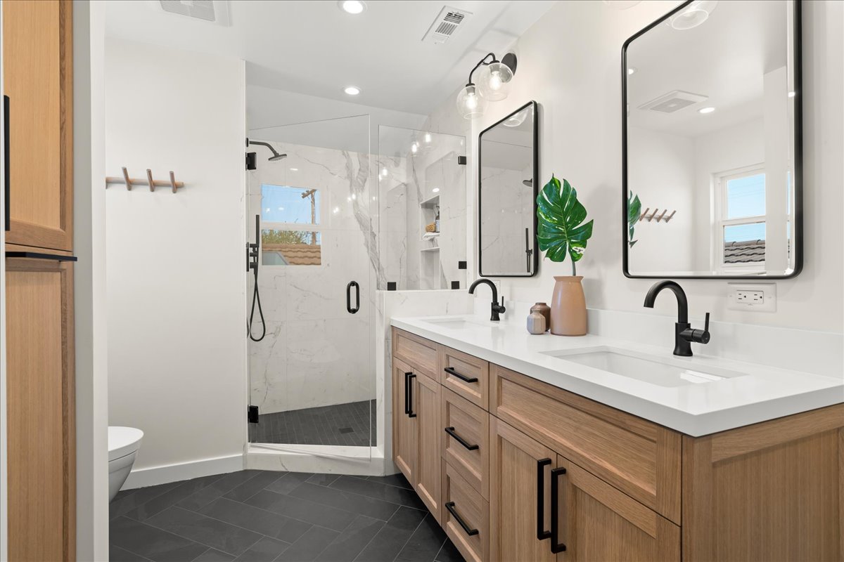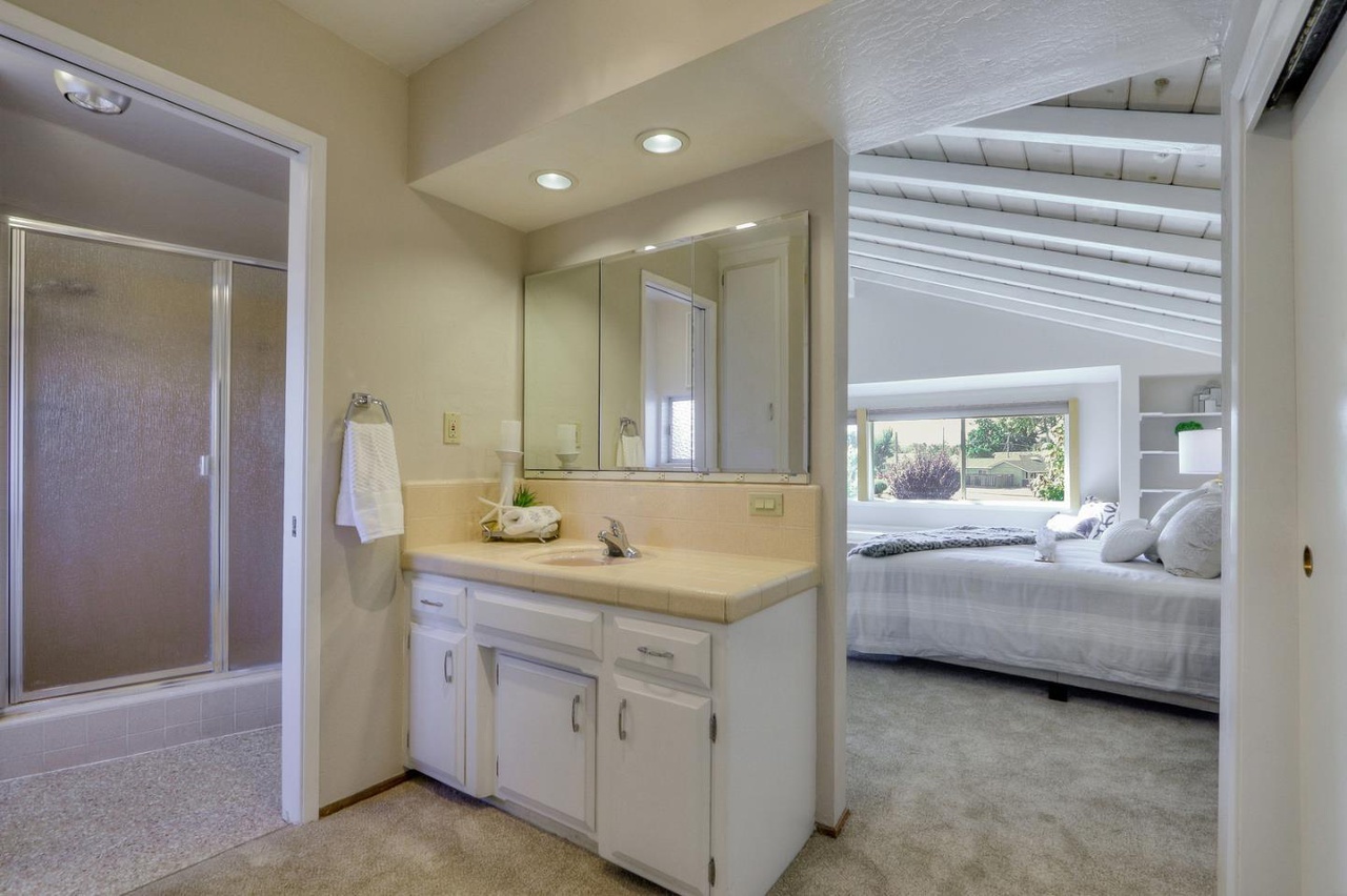 The Master bedroom now is an open and airy place for our clients to relax at the end of their days. New flooring graces the room in a warm deep brown, which compliments the original knotted pine vaulted ceilings. A lovely long window bench with adjacent shelves is the sweet final touch for this San Jose bathroom remodel. It is always a true honor when we have the pleasure of working with a return client, for another dream project of theirs.
