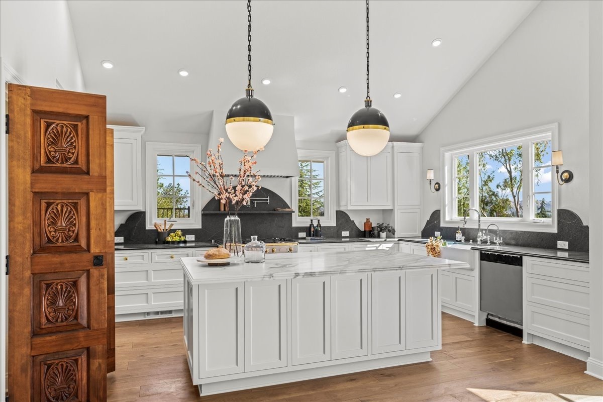 The heart of "Chateau Siliconé" lies in its grand great room and kitchen. The original dated layout was reinvented into an open-concept living space, complete with sun-soaked panoramic views. The once-separate kitchen and living areas now flow seamlessly, unified by the removal of walls and a boxy staircase. A newly designed kitchen boasts an oversized island, extended storage, and counter space, all visible from the front door. Vaulted ceilings and arched entryways infuse the space with character, reminiscent of a classic French country home.