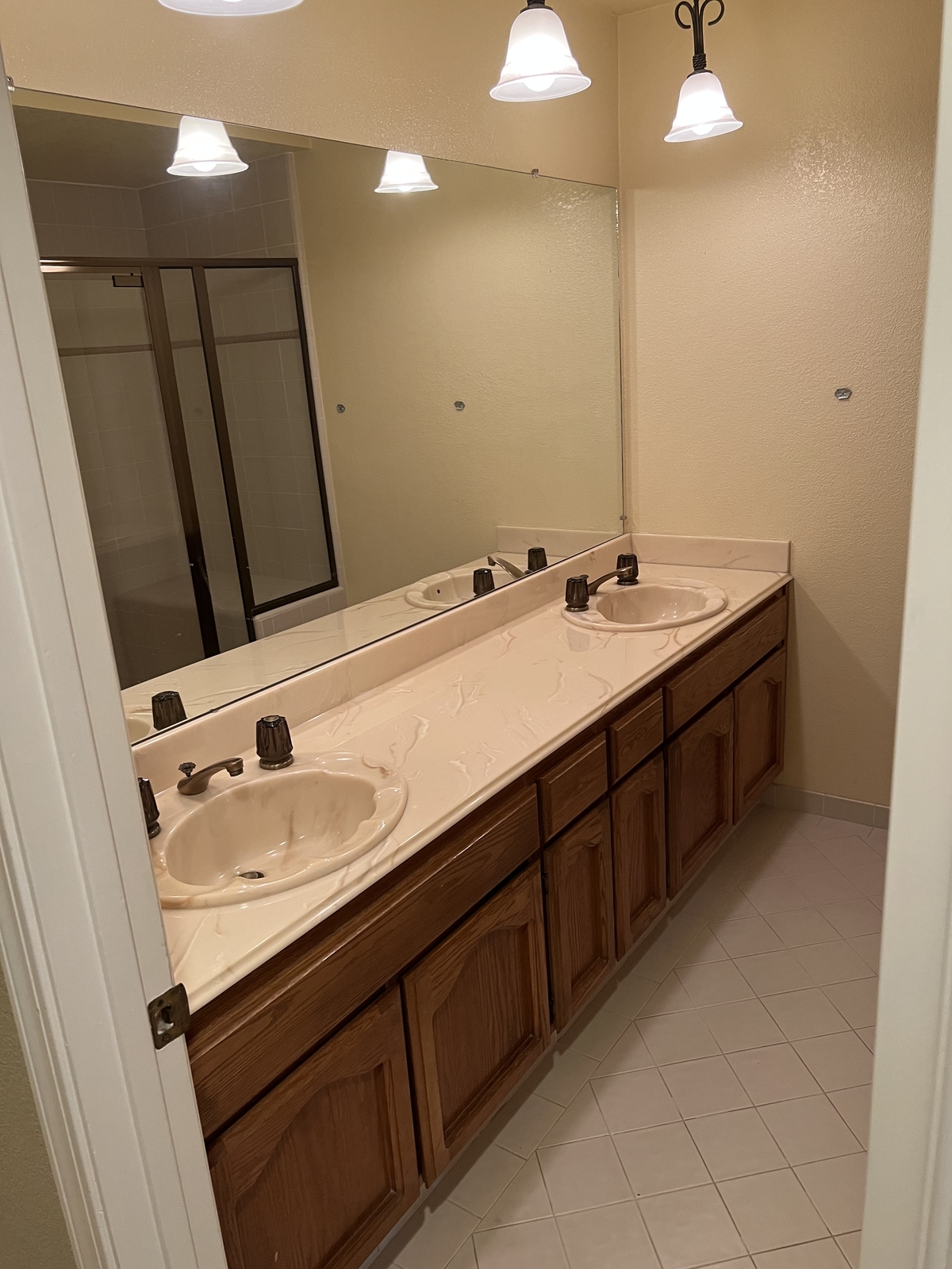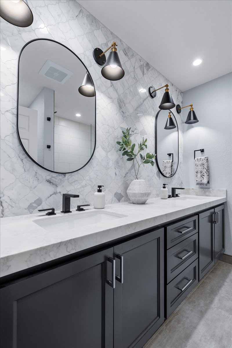 The hall bath was rejuvenated, with the existing vanity remaining, the old doors were replaced with a modern Sierra style painted in stunning Raven Black. This bath was adorned with brass and matte black light fixtures, matching black hardware and sink faucets to bring it all together. Cascading alabaster grey mosaic tiles gleam on the vanity wall, creating a perfect backdrop for oval shaped mirrors with jet black trim. An inviting walk-in shower has been given the ultimate face lift, descending matte white tiles grace the surrounding walls, gorgeous hexagon mosaics create an element of texture and depth against the brilliant white walls. This shower boasts not only a shower bench to relax on, but a convenient niche has been created so our clients can place their favorite shower essentials to be close at hand. This hall bath is now the perfect harmony of black and white.